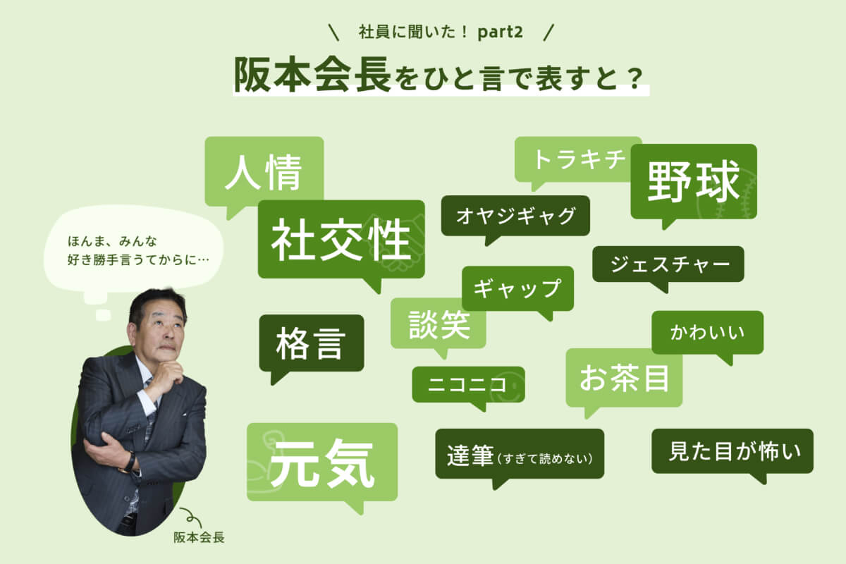 突然ですが、この採用サイトにある「数字で見る ケイ・アイ・エス」の中で、「社員に聞いた! 阪本会長をひと言で表すと?」というコンテンツがあるのをご存知ですか?
